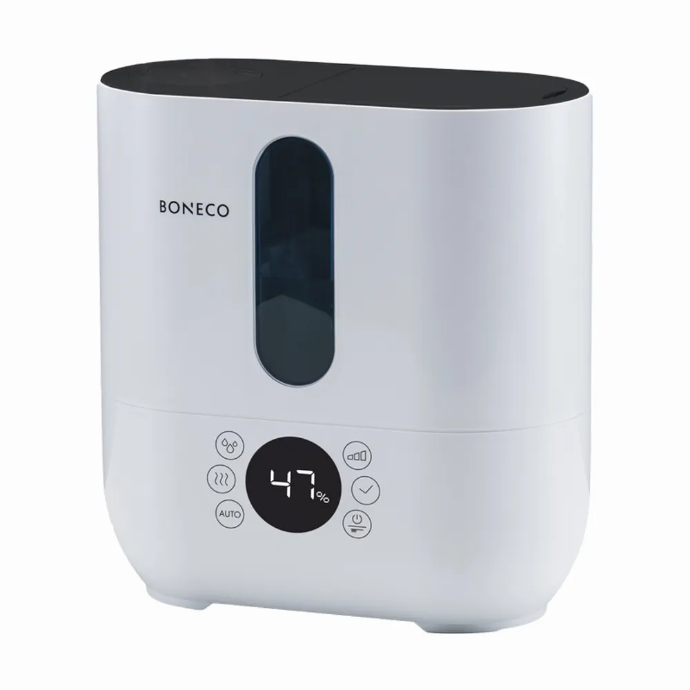 The U350 ultrasonic humidifier fulfills all air humidifying needs. Alongside the special attention given to user-friendliness, the design received the Red Dot Design Award (an internationally recognized quality label for excellence in design). The device can be filled with water from the top wherever it is being used, as well as from any position, and is controlled using the LED display. "AUTO" mode automatically and without worry humidifies the room air to an optimum relative humidity of 50%. This value is measured using a built-in humidistat and can be set as desired. The display provides an overview of all functions and maintenance instructions. The U350 offers refreshment with a cooling mist in summer and a comforting warm mist in winter. Essential oils can also be used for room fragrance depending on your preference. Thanks to effective high-frequency technology, the water is converted into a micro-fine mist and given off to the indoor air by a fan. The 2-in-1 A250 AQUA PRO water filter ensures pure humidification without leaving any residue. The included Ionic Silver Stick® utilizes the antibacterial effects of silver and ensures optimal water quality. These low-noise appliances have a very high level of humidification, which can be individually regulated by an output control. As the room temperature can fall slightly as the mist evaporates, most BONECO Ultrasonic Humidifiers can be set to give off cool or warm humidification at the press of a button.